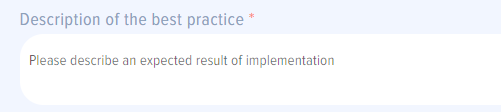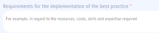 image.png - “Requirements for implementing the best practice” field. Here is to describe any requirements that are vital for a successful implementation of the best practice.