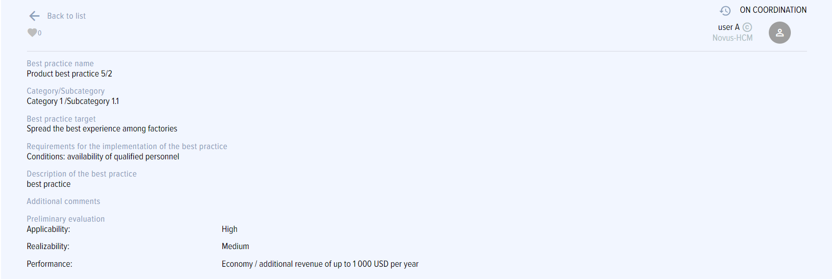 • When clicking “Add for coordination” button, the practice is sent for coordination to the employees added by the author of the practice. The practice is simultaneously sent to all coordinators.