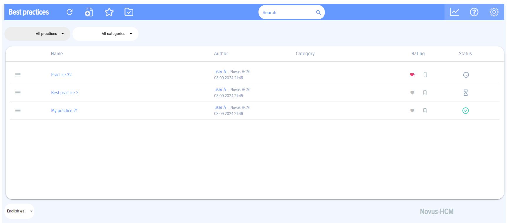 image.png - “All practices”, “My practices only”, “Drafts”, etc. – an additional filter. If “My practices only” is selected, the list of best practices shows only practices added by an employee.