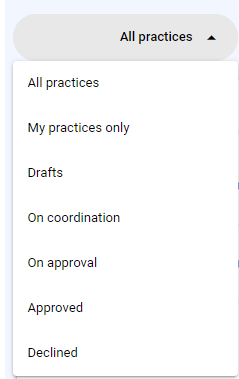 image.png - practice status. Please refer to Best Practice Statuses for further information on practice statuses. The following actions are available: Coordinate, Approve, Tasks (set practice tasks). These actions are available to respective roles.