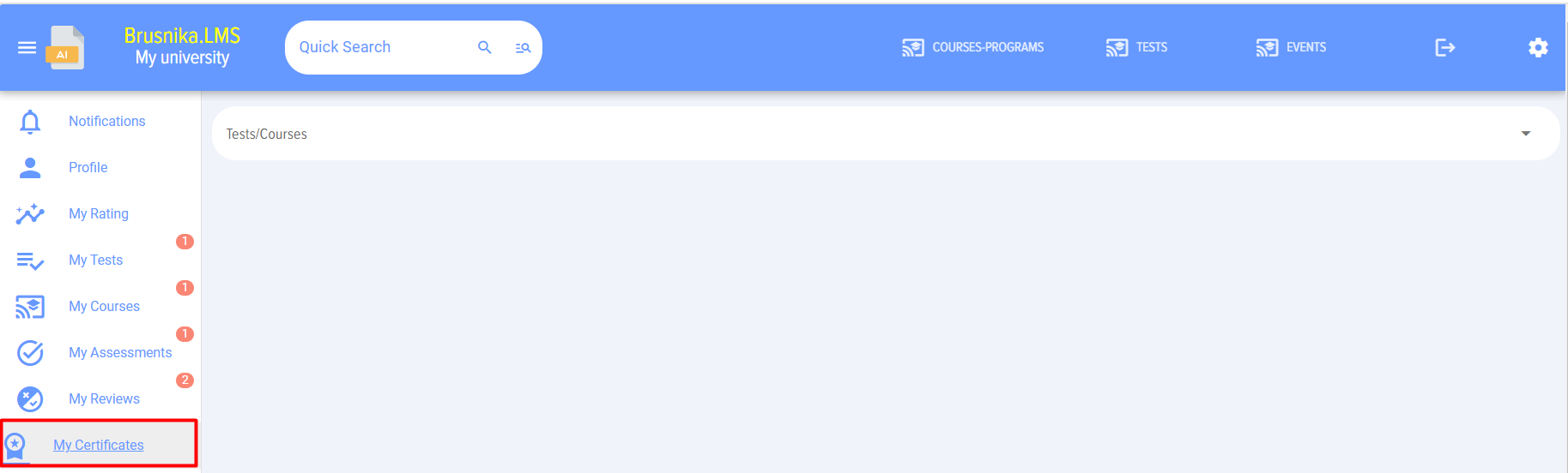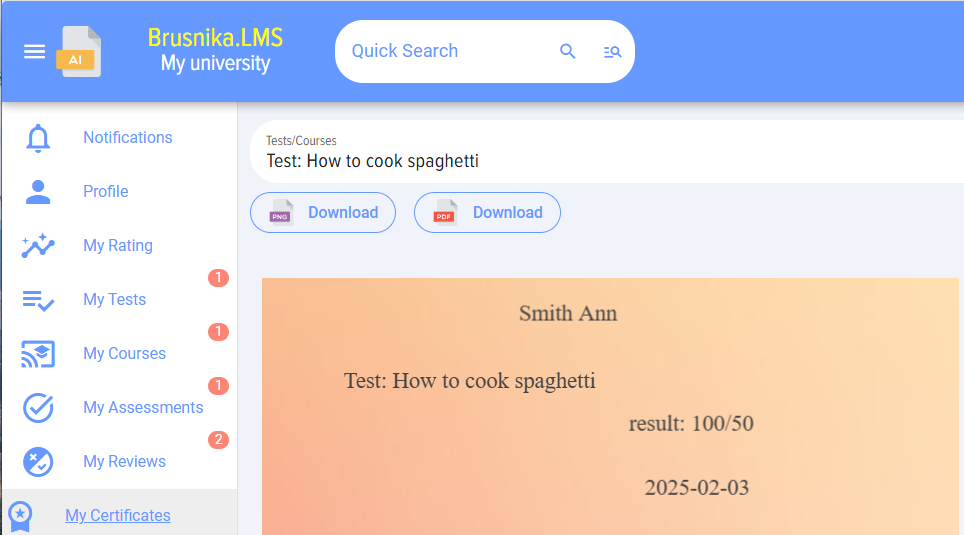 To print the certificate, click on the arrow. The courses and tests for which certificates are available will be displayed. After selecting a course/The test will output Certificate: