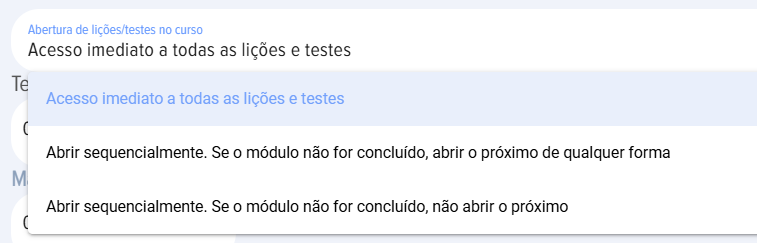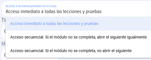 - secuencia de apertura de módulos en el curso. Por defecto se usa la opción en la que todos los módulos (lecciones/tests/materiales) están disponibles inmediatamente.