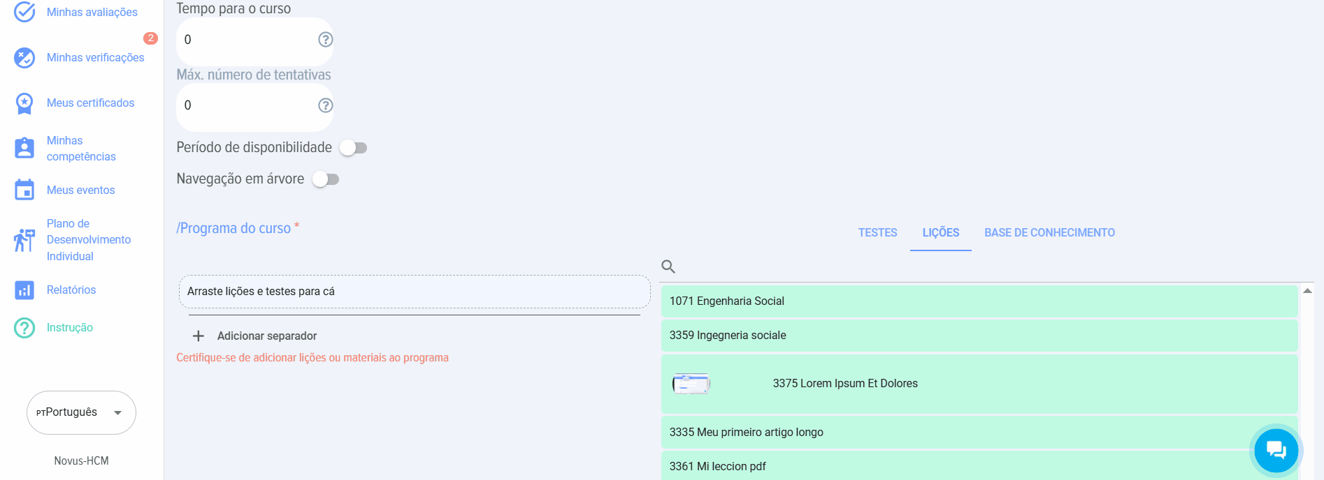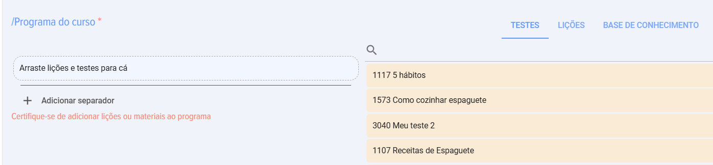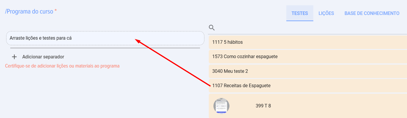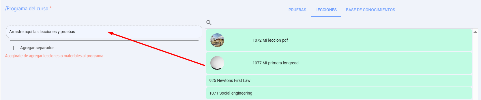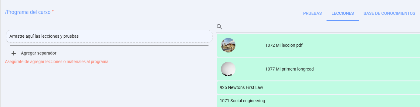 - Arrastre las lecciones/pruebas/materiales al área "Program del curso", en el campo "Arrastre aquí las lecciones y pruebas" y suéltelos. Asegúrese de que Lección/Test apareció en la columna "Program del curso".