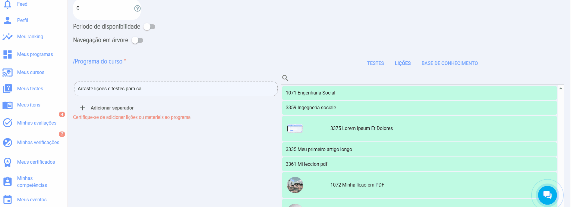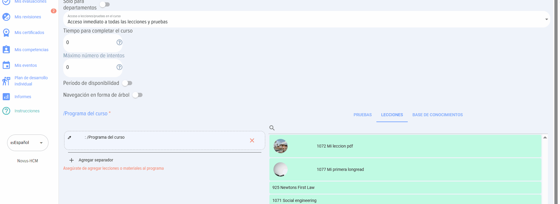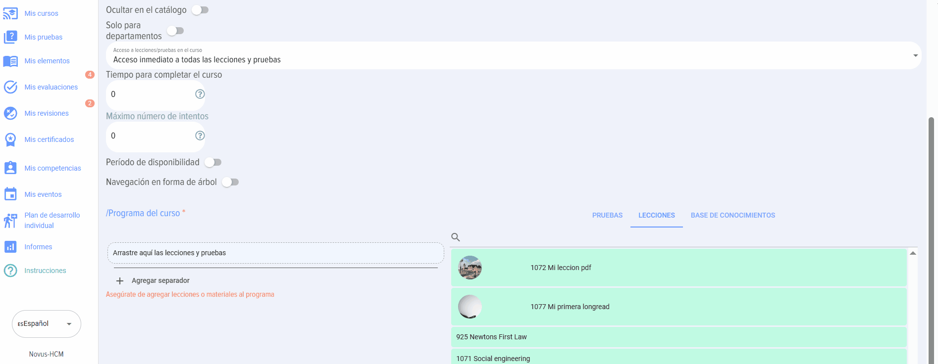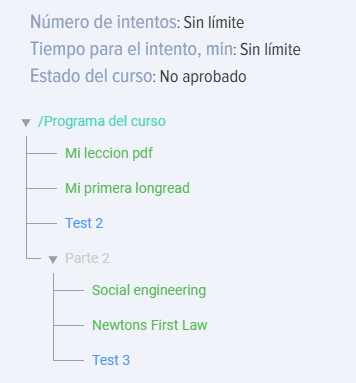 - Programa del curso. En forma de módulos de tests, lecciones, materiales. Es necesario añadir al menos un módulo (lección o material) al curso.