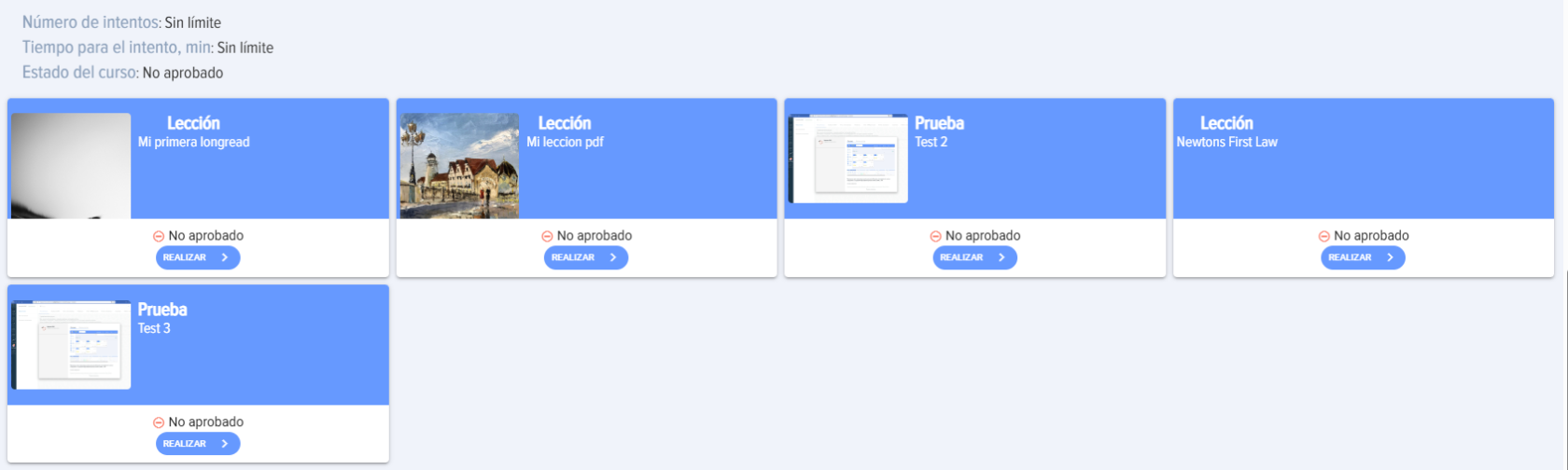 - Passed: Todos los módulos se han completado con éxito (pruebas, lecciones con el botón "Completar" presionado, materiales con el botón "Revisado" presionado).