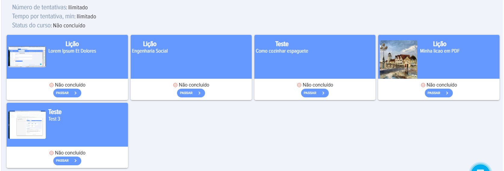 - Not Passed. Significa que alguno de los módulos Not Passed: Test, Lección (no se ha presionado el botón Finalizar), Material (no se ha presionado el elemento Conocido).