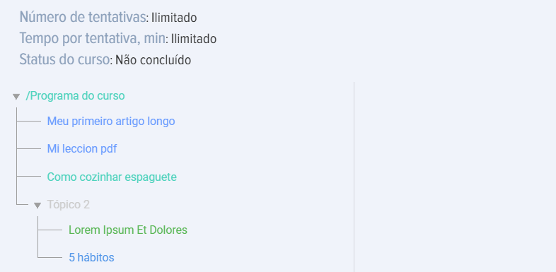 ¡IMPORTANTE! En las listas de lecciones, tests y materiales se muestran los publicados en la misma sección asignada al curso.