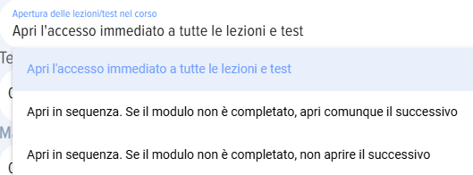 - sequenza di apertura dei moduli nel corso. Per impostazione predefinita, viene utilizzata l'opzione in cui tutti le lezioni/test/materiali del corso sono immediatamente accessibili.