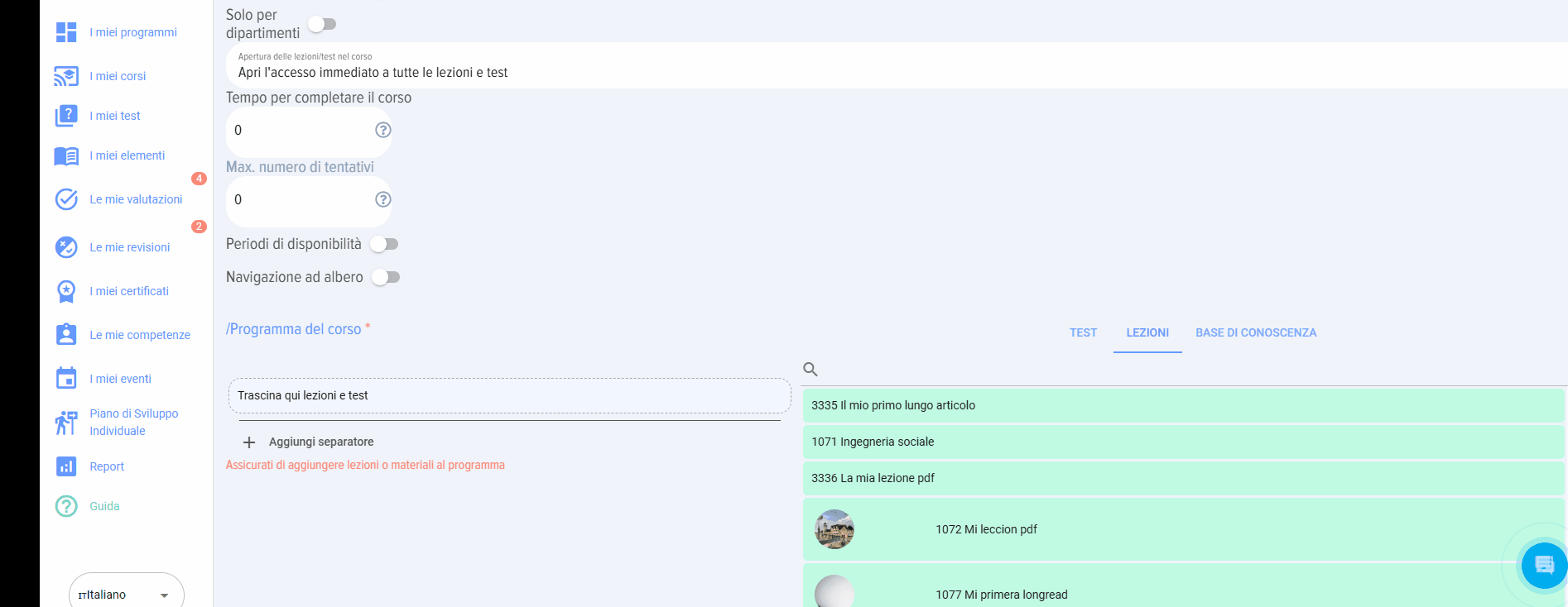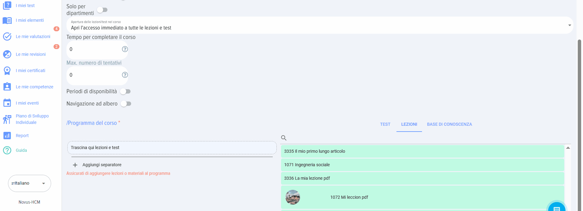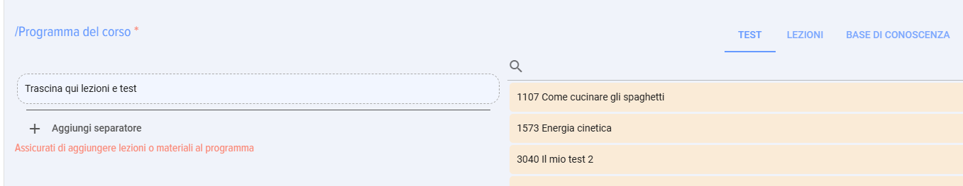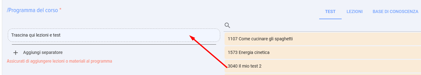 - Trascina le lezioni/test/materiali nell'area "Programma del corso", campo "Trascina qui lezioni e test" e rilascia. Verifica che la lezione/test sia nella colonna "Programma del corso".