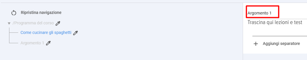 - Trascina nell'area (colonna) "Programma del corso" e rilascia. Verifica che la lezione/test sia nella colonna "Programma del corso".