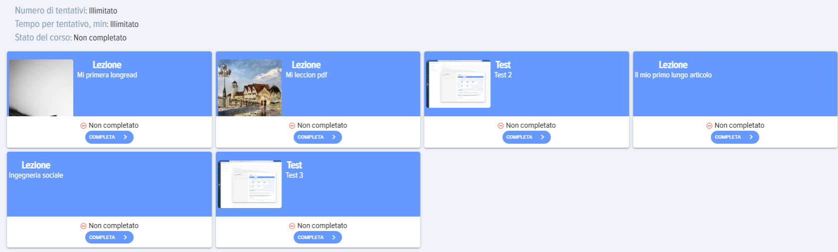 Non completato – Almeno un modulo non è stato completato: un test, una lezione (pulsante Completa non cliccato) o un materiale (elemento Letto non cliccato).