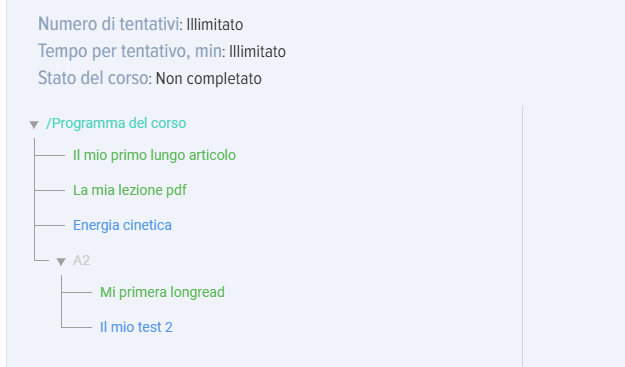 - Programma del course. Sotto forma di moduli da test, lezioni, materiali. È necessario aggiungere almeno un modulo (lezione o materiale) al course.