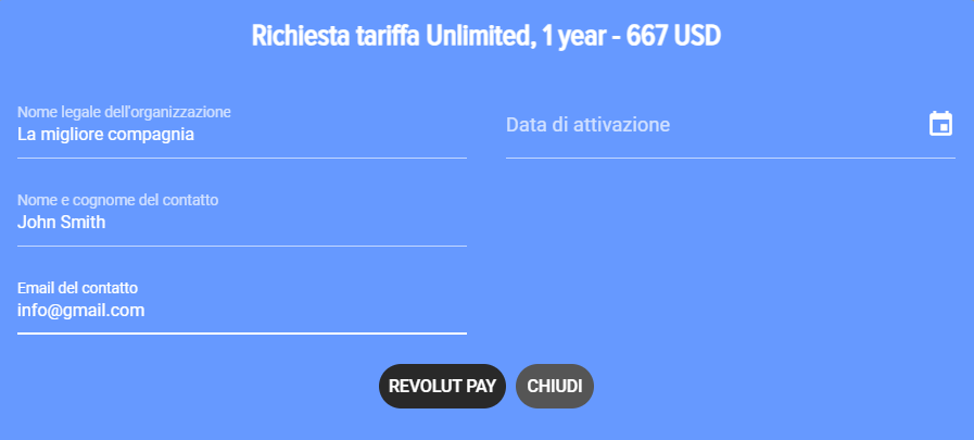 1.6. Clicca REVOLUT PAY. Dopo aver cliccato si aprirà il modulo di pagamento dell'abbonamento tramite il servizio REVOLUT PAY:
