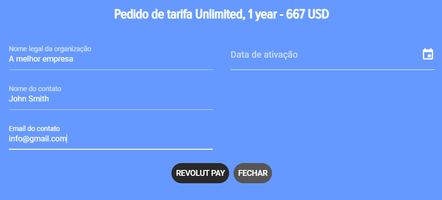 1.6. Clique em REVOLUT PAY. Após clicar, o formulário de pagamento da assinatura via serviço REVOLUT PAY será aberto: