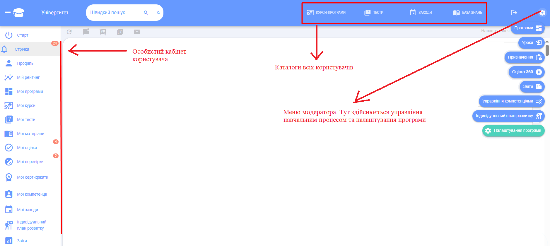- Модератор: Має найширші права. Здійснює загальні налаштування програми, наповнює її навчальним контентом та тестами, призначає навчання та тестування, а також має повний доступ до звітності по всіх співробітниках. Важливо зазначити, що модератор має розширеніші права в програмі, ніж Адміністратор порталу CRM-системи.