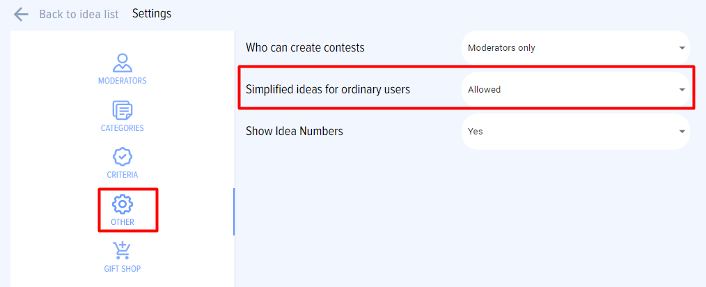For ordinary users creating simplified ideas is possible if the settings indicate Simplified ideas for ordinary users - allowed.