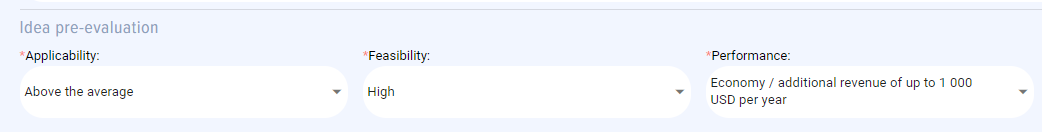 • Performance - estimated financial result of proposed idea implementation. Following options are available: Economy / additional revenue of up to 1 000 USD per year;  Economy / additional revenue of up to 10 000 USD per year; Economy / additional revenue of up to 100 000 USD per year; Economy / additional revenue of up to 500 000 USD per year; Economy / additional revenue of up to 1 000 000 USD per year; Economy / additional revenue of minimum 10 000 000 USD per year.