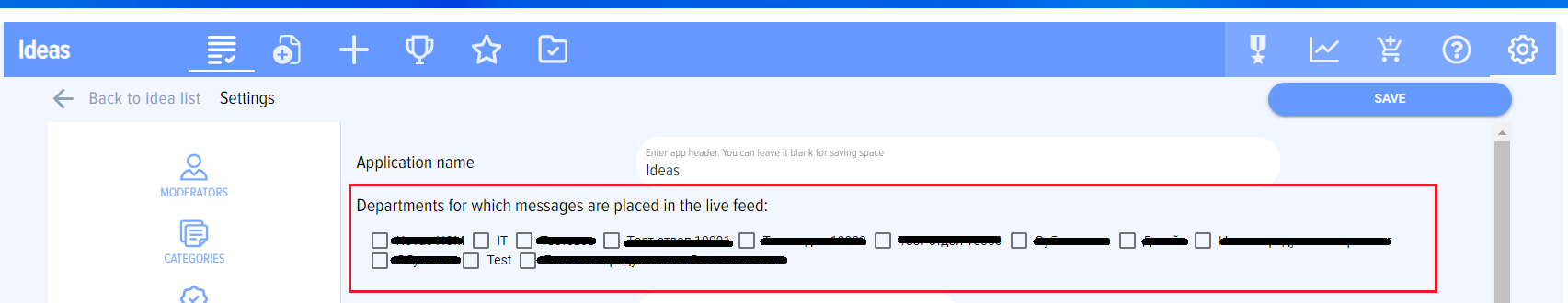 Selecting the departments for which messages are posted to the live feed
