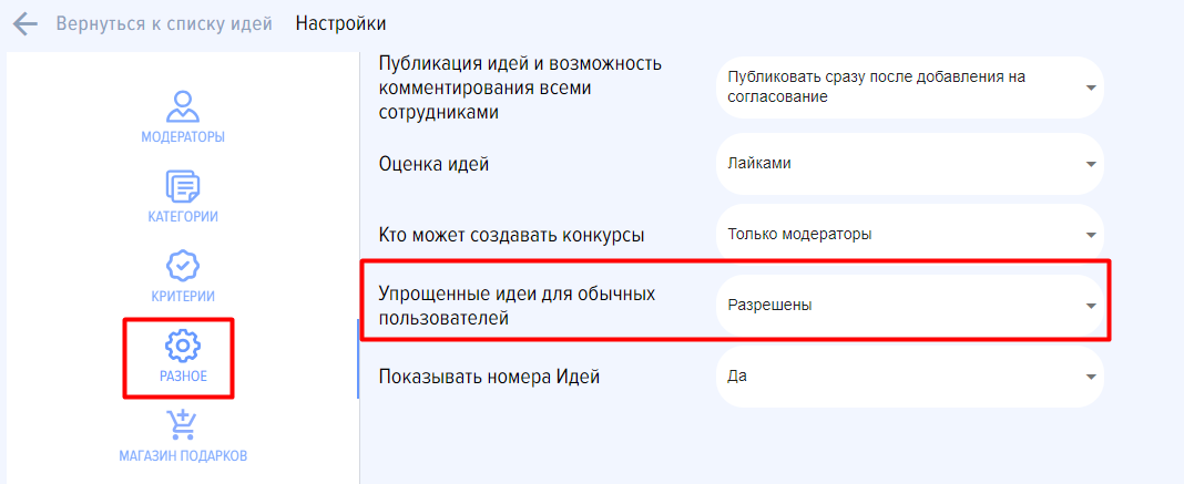Для обычных пользователей создание упрощённых идей возможно, если в настройках указано «Упрощённые идеи для обычных пользователей» – разрешены.