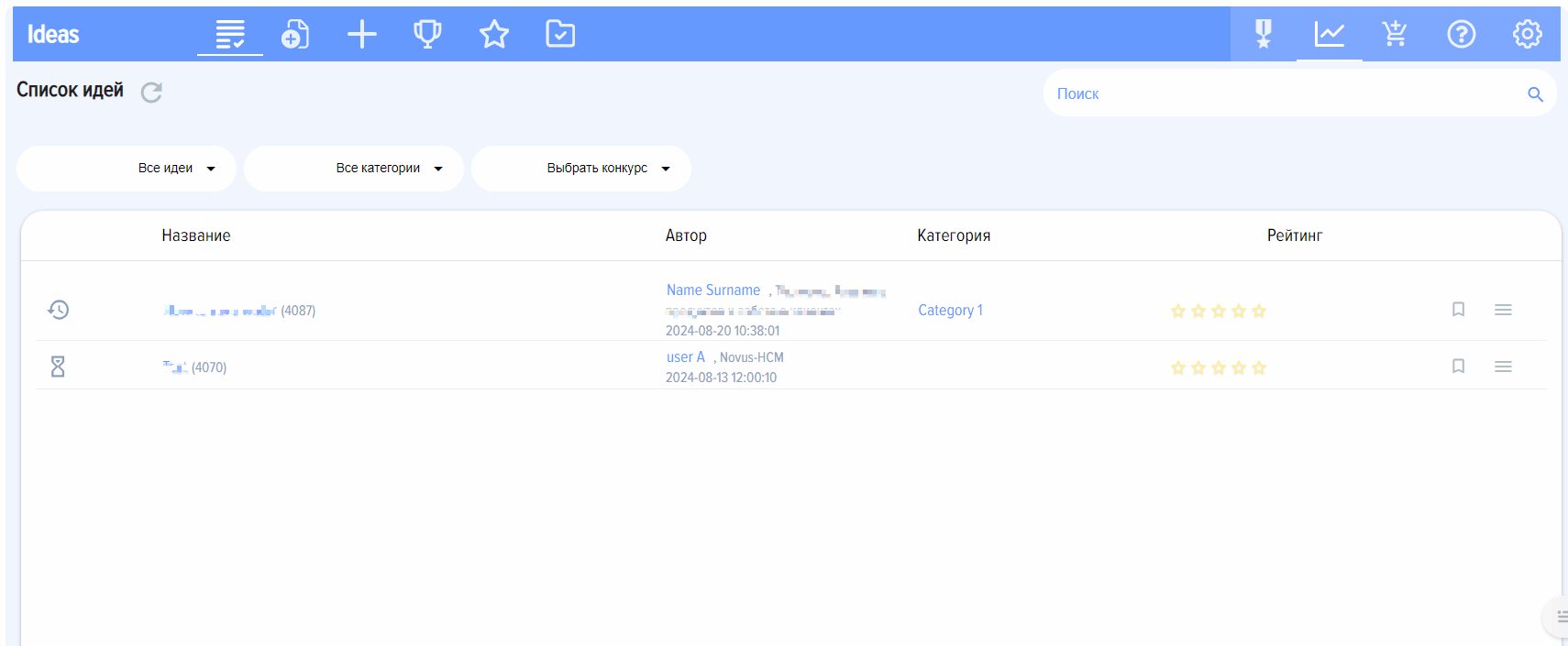 - Оценка идей сотрудниками. Показывает идеи, набравшие наибольшее количество баллов.