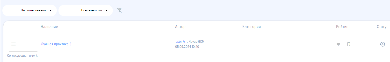 При выборе в главном меню фильтра «На согласовании» отображаются все практики, которые находятся на согласовании. В практике появляются сотрудники, которые согласуют практику:
